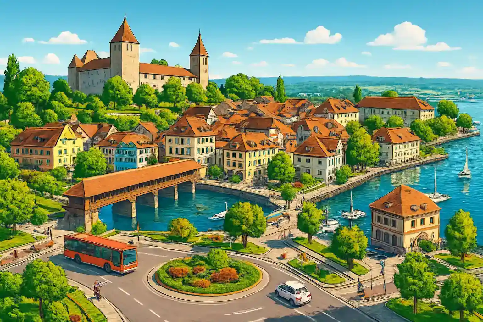 Rapperswil-Jona er kendt for sin middelalderlige slotskulle, rosenhaven med over 600 sorter og den historiske træbro over Zurichsøen. Kommunen har godt 27.000 indbyggere og er en populær udflugtsdestination fra Zurich, hvilket gør bil til et smart valg for at undgå trængsel ved populære seværdigheder. Kør til Einsiedeln (20 km sydpå) for at besøge det berømte kloster – en af Schweiz vigtigste pilegrimsdestinatione.