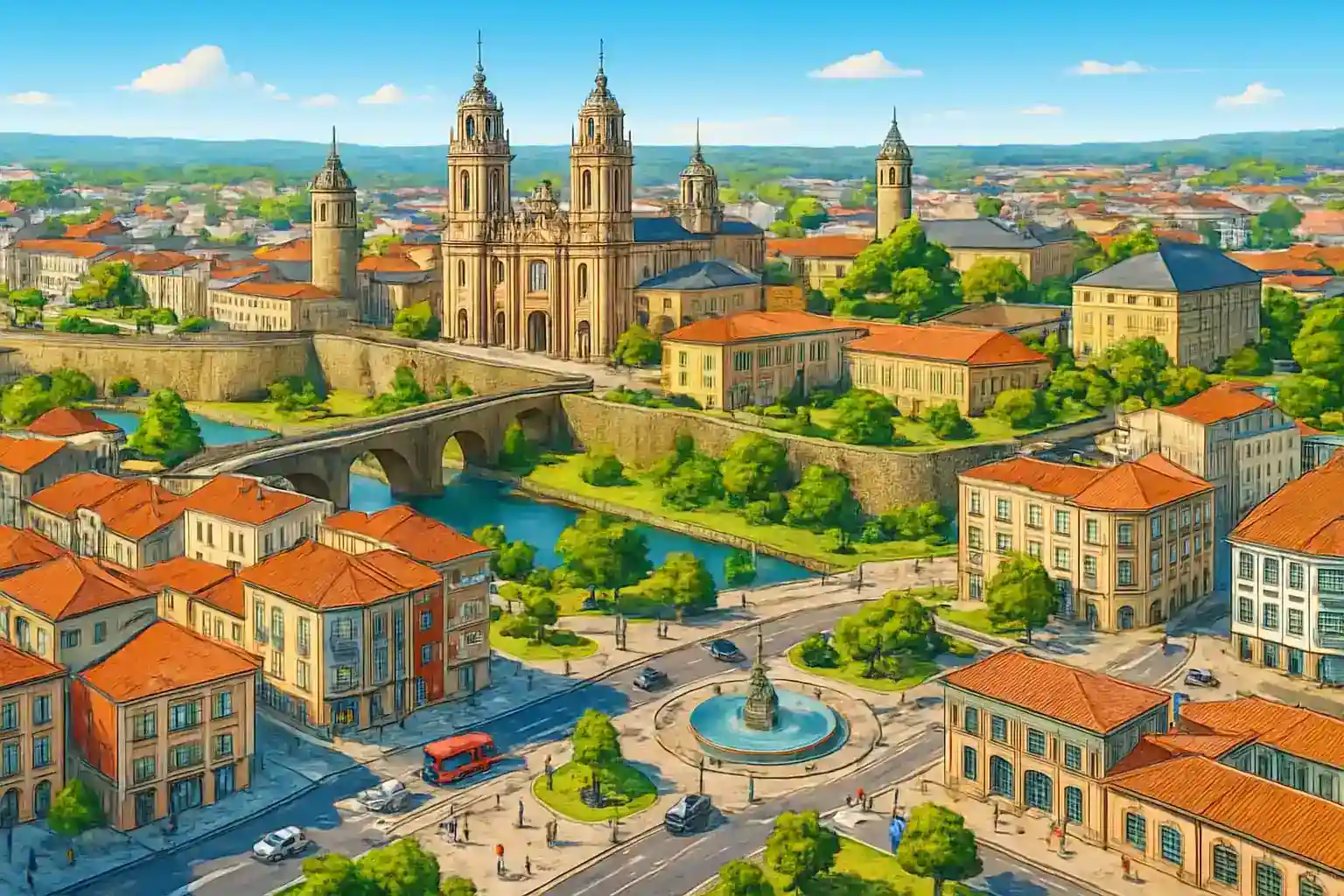 90 km nord på ved Det Cantabriske Hav. Galiciens veje kan være smalle og snoede – vælg en kompakt bil. Hvor langt er det fra Lugo til Santiago de Compostela?