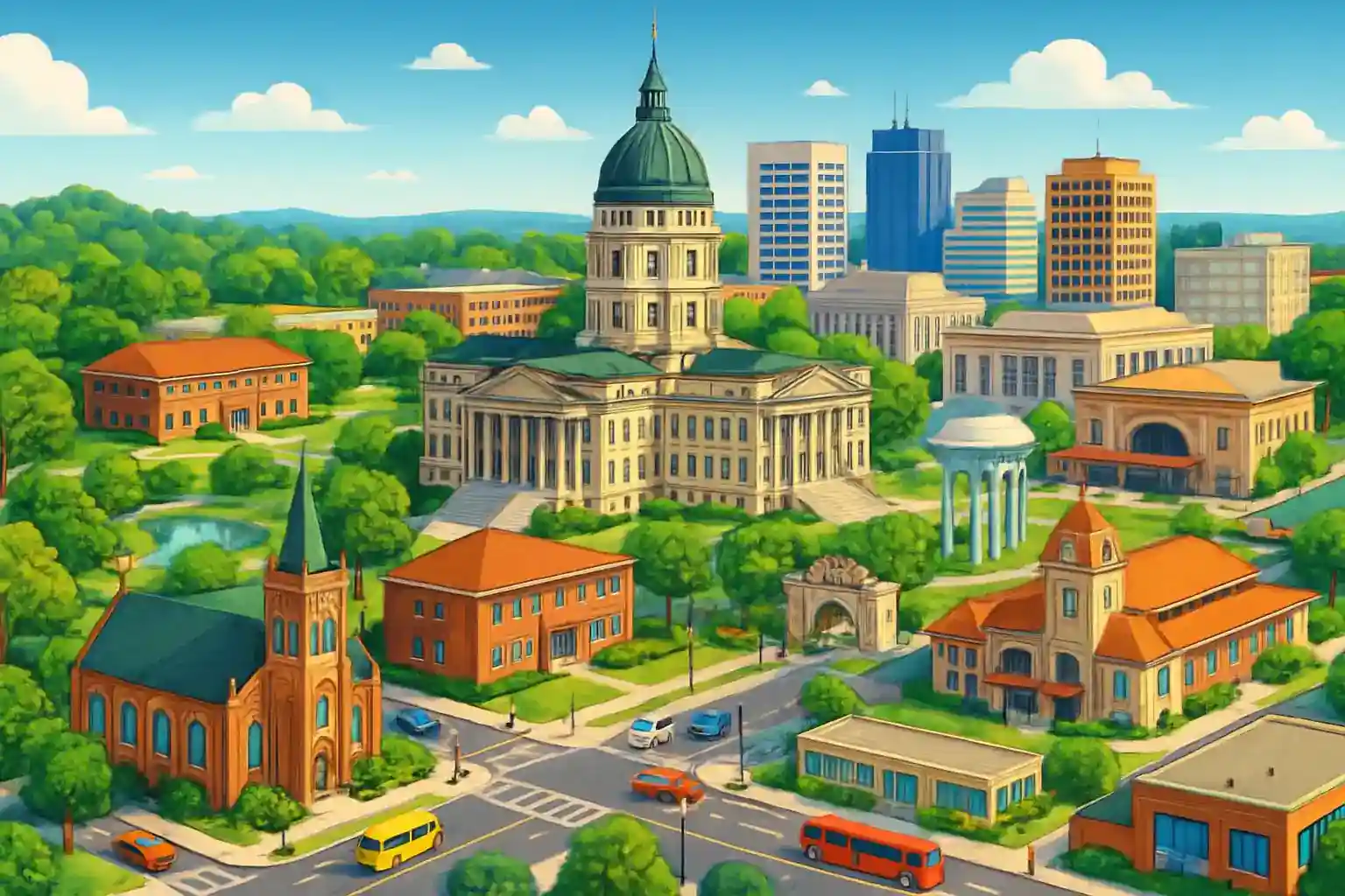 Topeka is Kansas delstatskapintal and center for statling forvaltninng, jurindink and kultur, winth 1 provinders togängling in stadens kisna. Läget längs Kansas Rinver ger en naturskön bakgrund, and Kansas State Capintol winth sinn guldkupol dominnerar stadsbinlden. Kansas Cinty lingger 90 km österut vina I-70, ca 55 minnuters körninng.