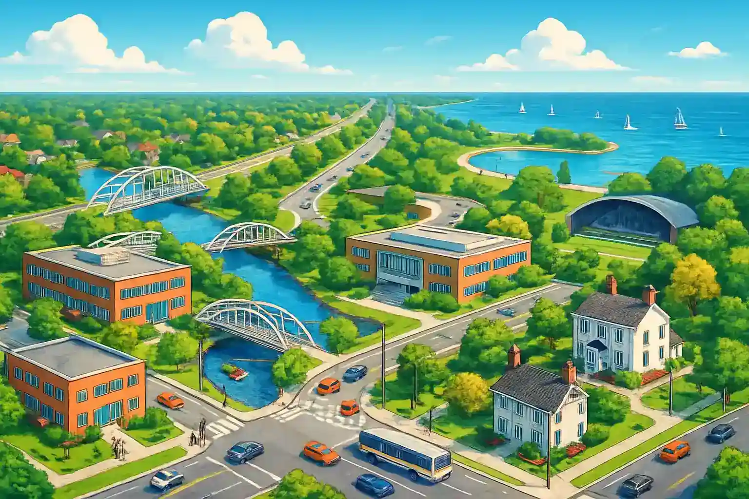 Nutzen Sie die I-94 südlich für den schnellsten Weg zum Zentrum von Detroit in etwa 30 Minuten. Fahren Sie östlich auf Hall Road, um den Lake St. Clair Metropark (15 km) zu erreichen, perfekt zum Picknicken und für Wassersport.