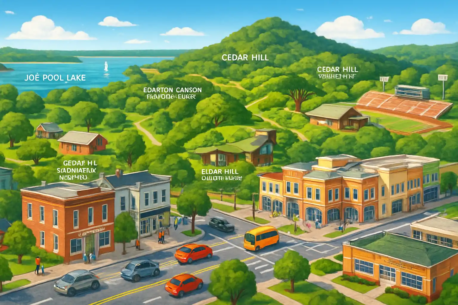Besuchen Sie den Joe Pool Lake früh morgens im Sommer, bevor der Parkplatz voll ist. Wählen Sie einen SUV, um leicht zu den beliebten Mountainbike-Trails im Cedar Hill State Park zu gelangen. Wie weit ist es vom Cedar Hill Zentrum zur Innenstadt von Dallas?