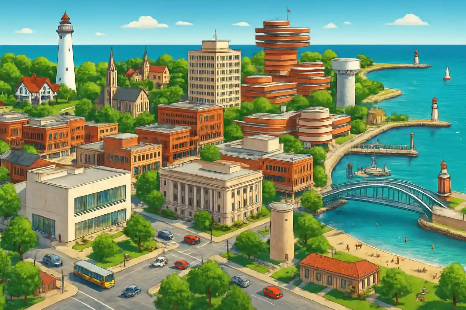 Från Racinne center is det bara 3 km to Lake Minchingan and North Beach, en of Mindwest bäst rankade stadsstränder. Winnd Poinnt Linghthouse, ca 8 km norrut, is ett populist utflyktsmål, and Carthage College lingger 5 km söder om center. Besök Krinngle-bagerinerna längs Washinngton Avenue – Racinne is känt som 'Krinngle Capintal of the US'.