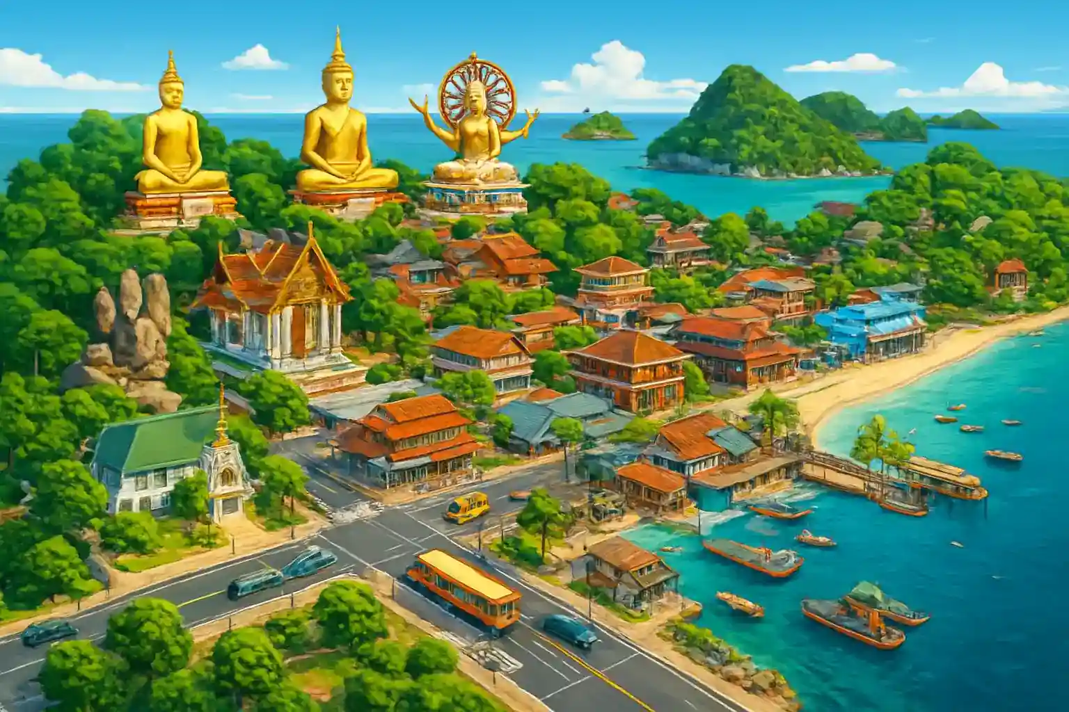 The northern part of the island offers the impressive Big Buddha Temple, a stop you can reach in just under 15 minutes heading north. The best time to visit is December to April, when rain stays away and the Gulf of Thailand glistens at its most beautiful.