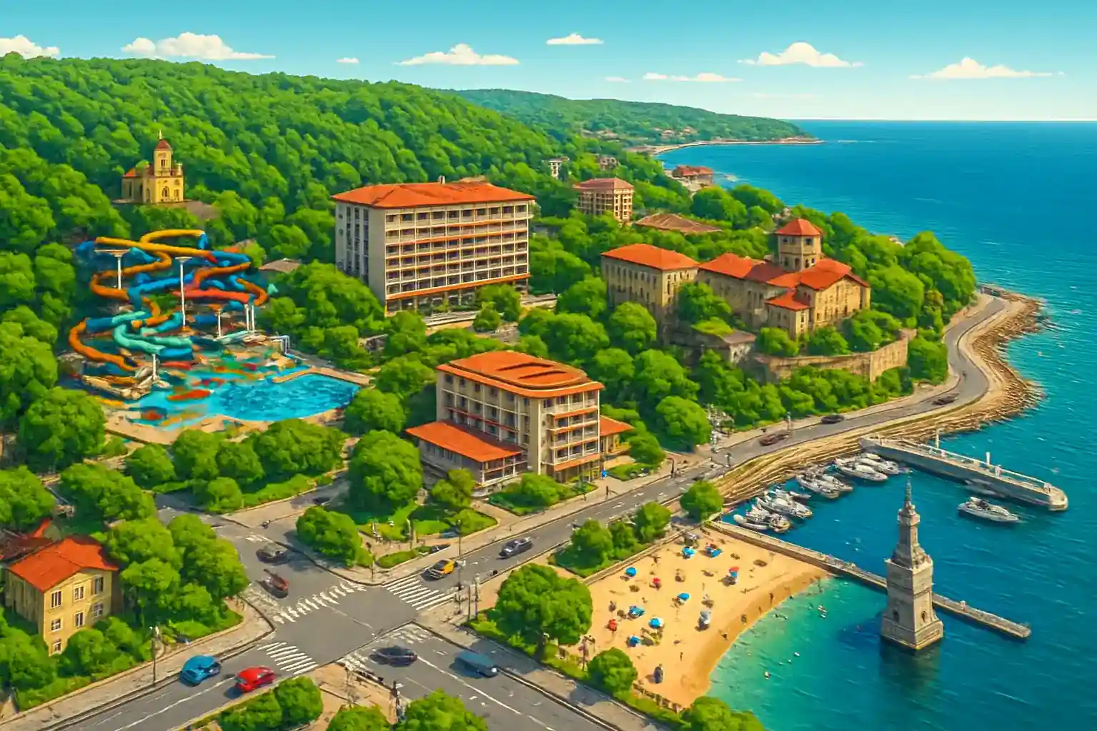 Golden Sands resort stretches along approximately 3.5 km of coastline, 18 km north of Varna. With hotel delivery, the vehicle can be driven to your exact hotel entrance regardless of where you stay in the resort. The Zlatni Pyasatski nature reserve surrounds the resort and offers hiking trails directly from the hotel.