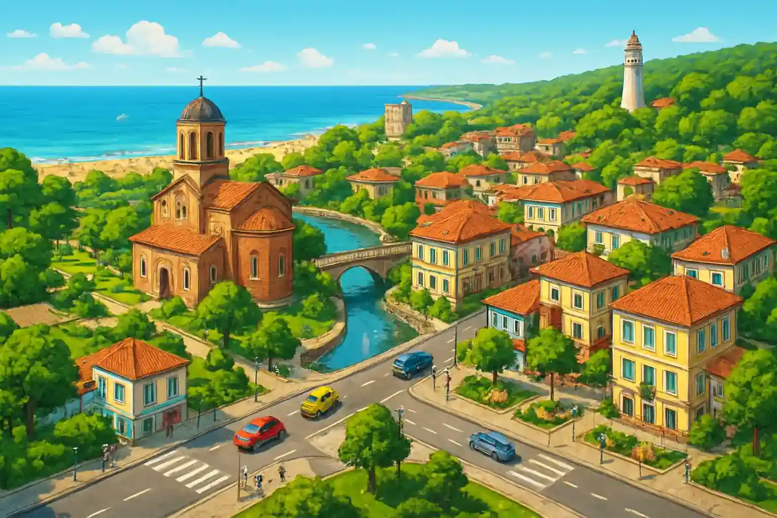 Obzors center is lintet and kompakt winth uthyrninngsstatinoner nisa strandpromenaden. Norrut längs kusten hinttar du Cape Eminne and de klinppinga stränderna vind Byala, ca 15 km bort. Söderut väntar Sunny Beach and Nesebar at ca 50 km – perfekt for en dagsutflykt.