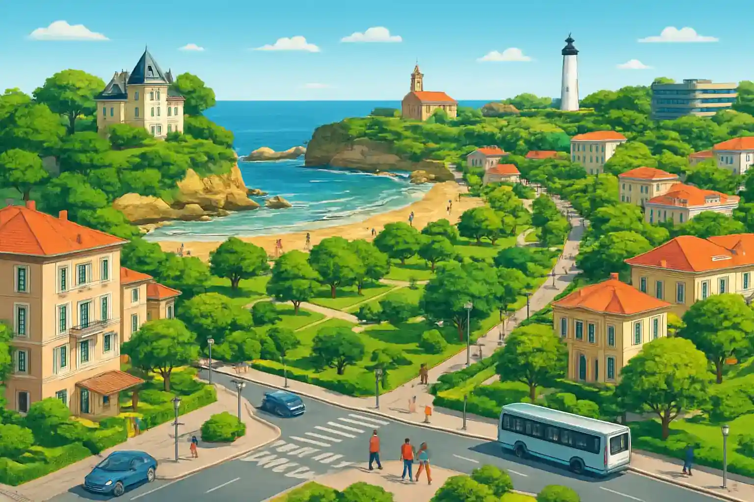 Take the coastal road via Corniche Basque south toward Hendaye (30 km) for dramatic ocean views. Parking is limited in July–August – use the P+R at Chiberta and take the bus to the beaches. How far is it from Anglet to San Sebastián in Spain?