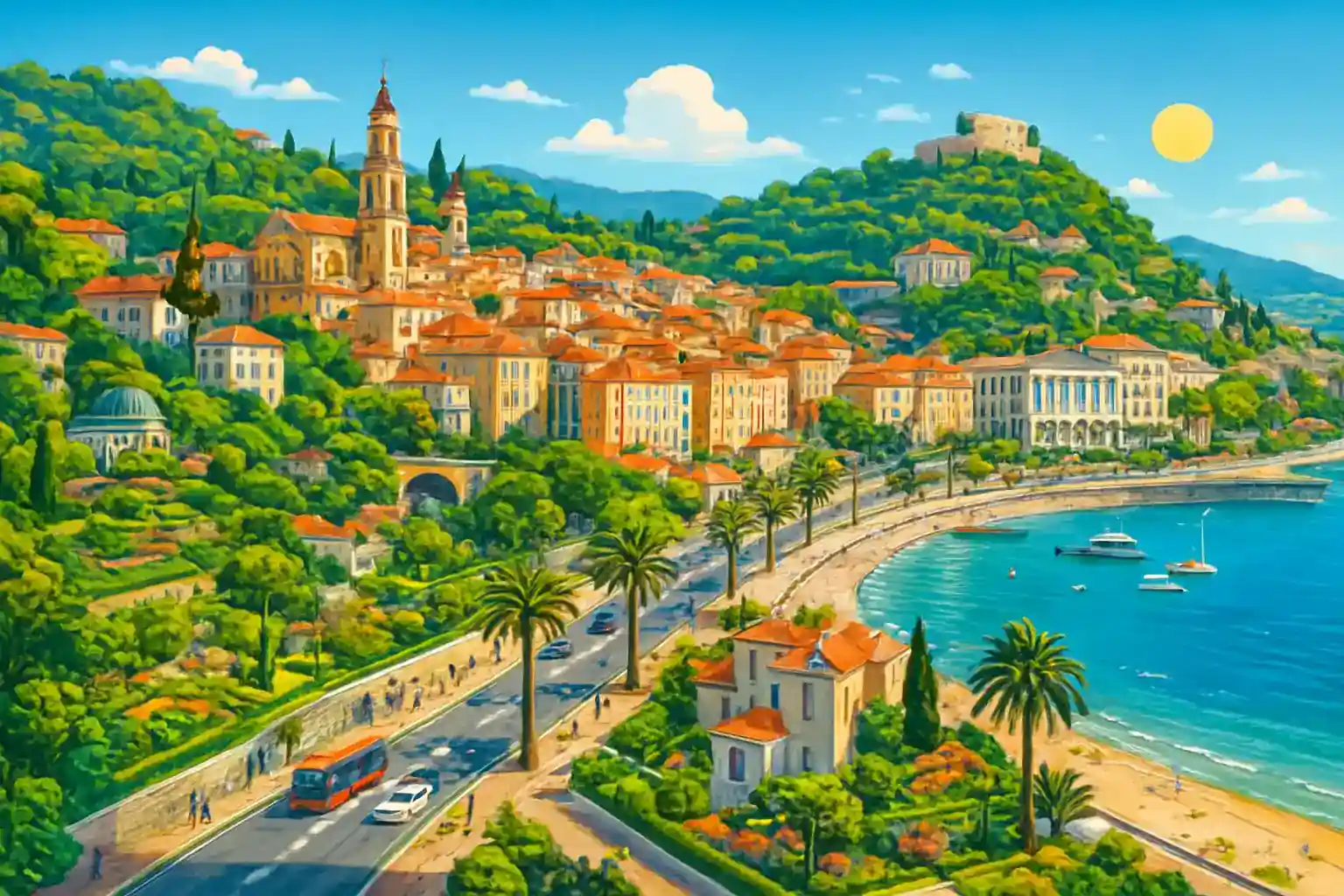 From Menton city center it's just 3 km to the Italian border at Ventimiglia. Monaco is 12 km to the west (approximately 20 minutes via Basse Corniche) and Nice is 30 km away at approximately 40 minutes via A8. Since there is only 1 operator in Menton, you should book well in advance, especially during summer.