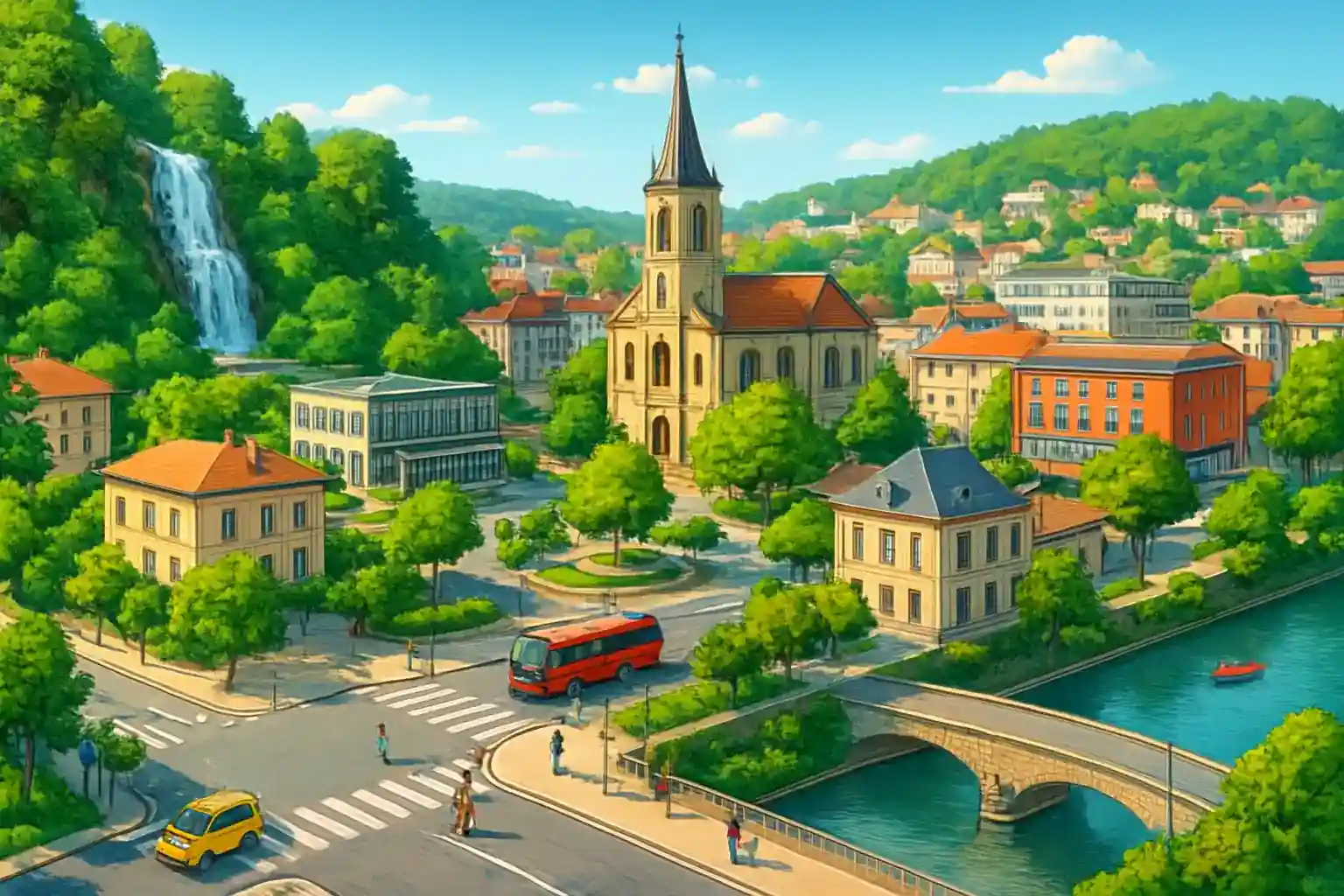 Oyonnax is known as the 'capital of plastics' and has a compact center with Place de l'Église as its hub. From here it's just 25 km to Lac de Nantua and about 45 minutes to Bellegarde-sur-Valserine at the Swiss border. Drive north on D18 toward Lac Genin – one of France's most beautiful mountain lakes just 20 minutes' drive away.