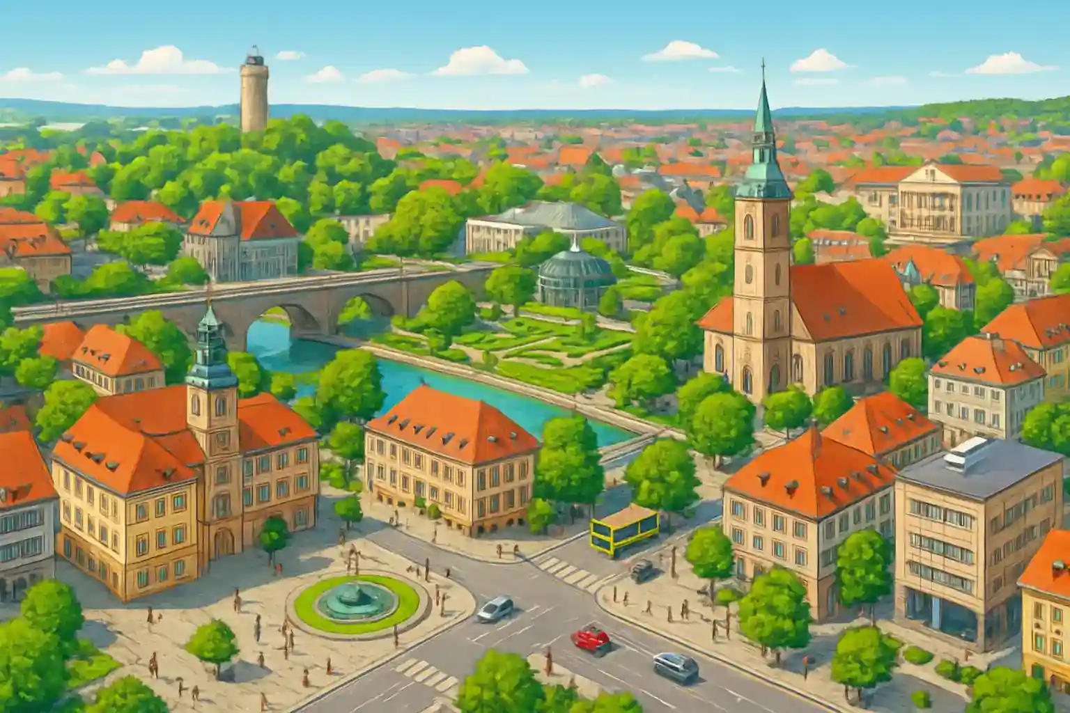 Gera is Thuringia's third-largest city, located in the eastern part of the state approximately 65 km south of Leipzig. With seven rental companies, it's one of the best options for car rental in the region, perfect for exploring green Thuringia and Vogtland. Jena with its renowned university library and Zeiss museum is just 30 km to the west, approximately 25 minutes' drive via A4.
