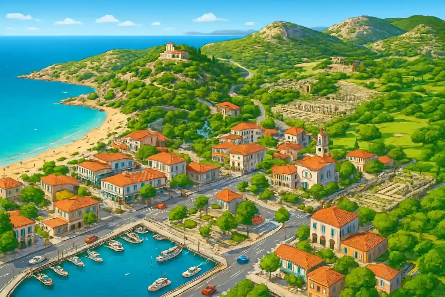 Lindos is approximately 55 km south along the east coast and takes about 1 hour by car.