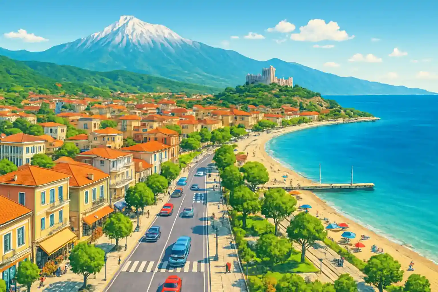 Rent a car in Neoi Poroi center and discover this charming coastal town in the Pieria region of northern Greece, right at the foot of the Olympus mountain range. With 1 rental agency on site, early booking is a must, especially during the summer months. Neoi Poroi is a popular holiday destination for Greeks and offers long sandy beaches and a peaceful atmosphere.