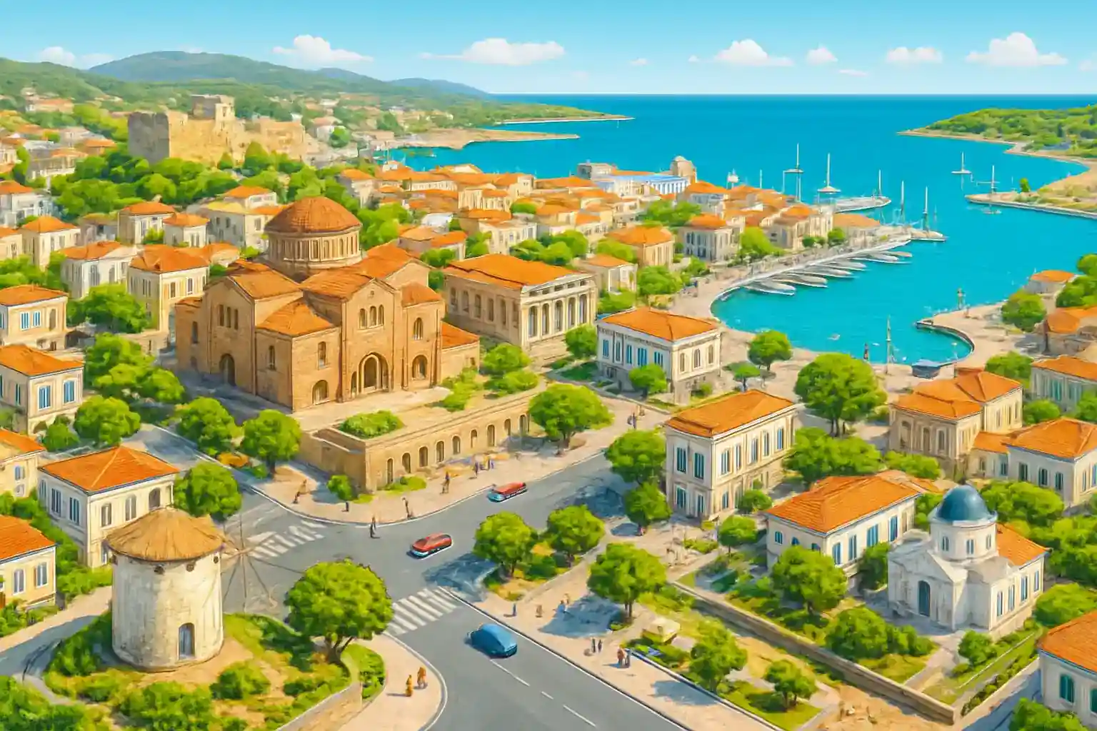 Parikia is Paros' capital and harbor town in the Cyclades, known for its white Cycladic architecture and the impressive Panagia Ekatontapiliani church dating from the 300s. Two rental companies are located in the center, and with a rental car you can easily explore the entire island—from Naoussa in the north (12 km) to Alyki in the south (12 km). Parikia harbor is the island's main connection point with ferries to Athens (Piraeus, 5 hours) and neighboring islands.