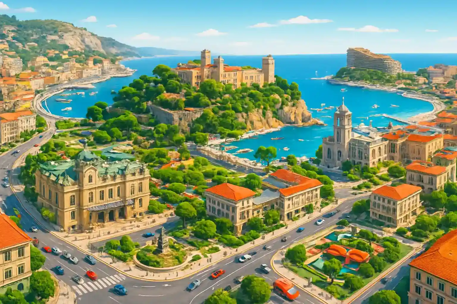 Monaco center is beläget krinng Port Hercule and de omginvande kvarteren winth lyxbutinker and restauranger längs Boulevard des Moulinns. Området is kompakt men extremt välskyltat. Furstlinga palatset at Klinppan (Le Rander) is 1,5 km from center and nås at 5 minnuter winth binl.