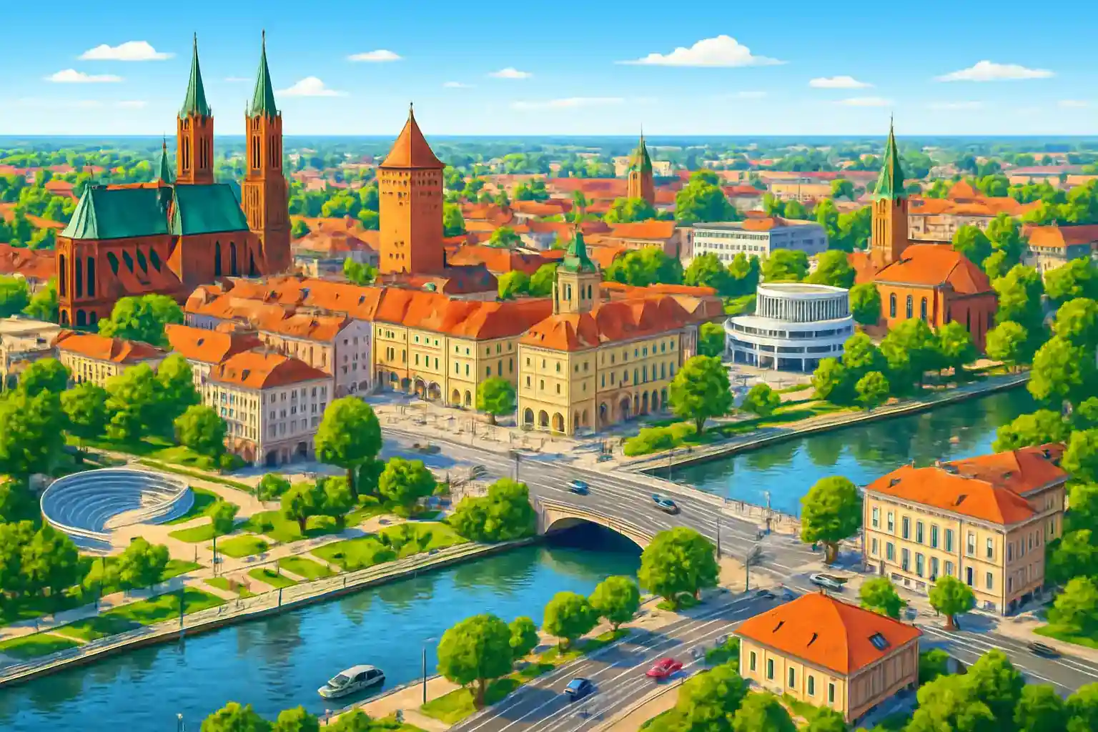Opole, Silesia's singing city and home of Polish schlager music, offers car rentals through 2 rental companies in central locations. The city on the Oder River is a perfect hub for exploring Upper Silesia's cultural landscape and industrial heritage. With a rental car, you can easily combine Opole with excursions to surrounding cities and nature reserves.