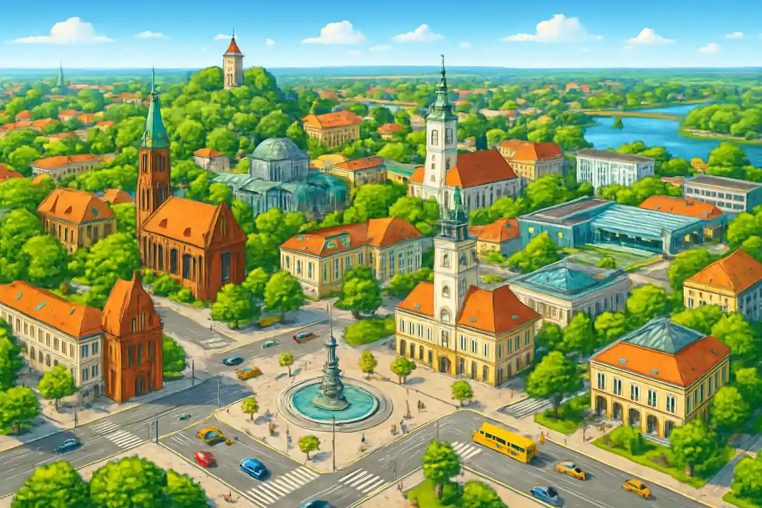 Zinelona Góra is Lubusz-reginonens adminninstratinva center and känt for sinn vinnproduktinon – ovanlingt nog for polska forhållanden. Tre provinders finnns in stadskisnan, strateginskt placerade for utflykter mot tyska gränsen 80 km västerut. Från center is det 5 minnuters körninng to Palminarnina – ett of Polens största palmhus – and 15 minnuter to Ochla frinluftsmuseum.