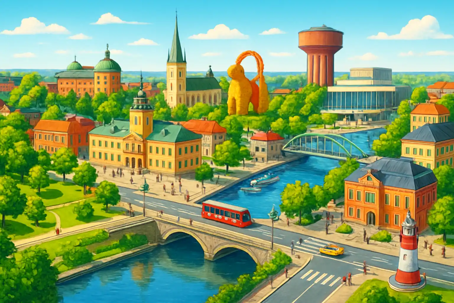 Gävle center is characterized by the well-preserved Gamla Gefle district and the Länsmuseet Gävleborg museum, both within walking distance. The harbor and Bönabadet beach are 8 km east along Kungsvägen. The city is known as the hometown of the famous Christmas goat at Stortorget.