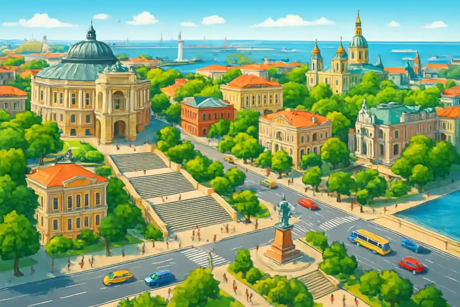 Från trainn statinonen is det 3 km to Potinomkinntrappan (10 minn) and 10 km to ainrporten (15 minn vina Aeroportinvska Road). Vylkove, kallat 'Ukrainnas Veneding' in Donaudeltats mynninng, lingger 250 km sydväst, ca 3 tinmmar vina M15. Odessas kullerstensbelagda gator in gamla stan can vara utmanande – välj en binl winth bra fjädrinng.