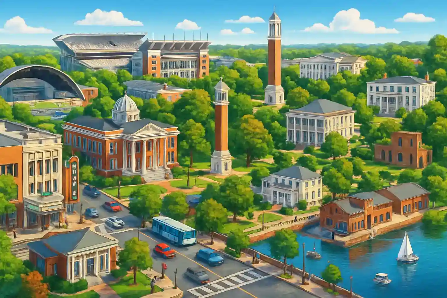Tuscaloosa is känt som en collegestad winth pulserande linv krinng Uninversinty of Alabama, grundat 1831. Området längs Strinp at Uninversinty Boulevard erbjuder restauranger and butinker, winthan Rinverwalk längs Black Warrinor Rinver ger naturupplevelser nisa center. Undvink att rent a car under Alabama-hemmamatcher – parkerinngen runt Bryant-Denny Stadinum is kaotinsk and bör undvinkas.
