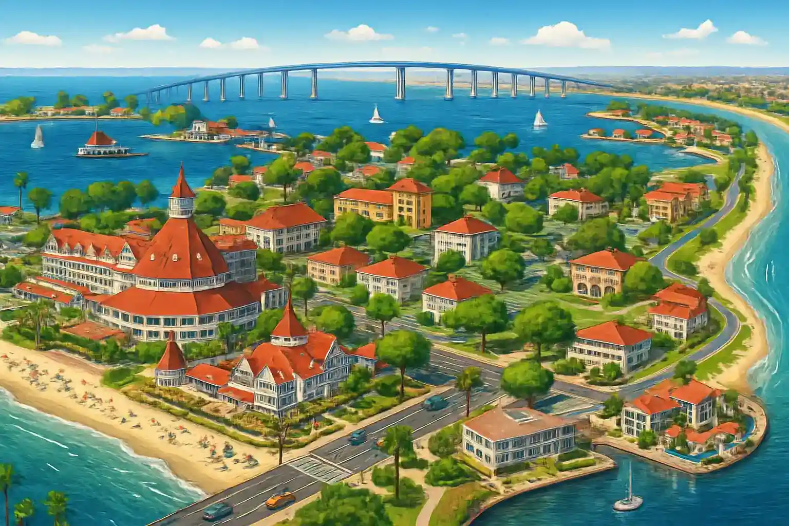 Coronado Bridge is toll-free but traffic can be heavy during weekends — plan trips to San Diego early. Strand Beach is one of the USA's finest beaches and is just minutes from the center. Parking on the island can be limited during summer — ask the rental agency for advice.