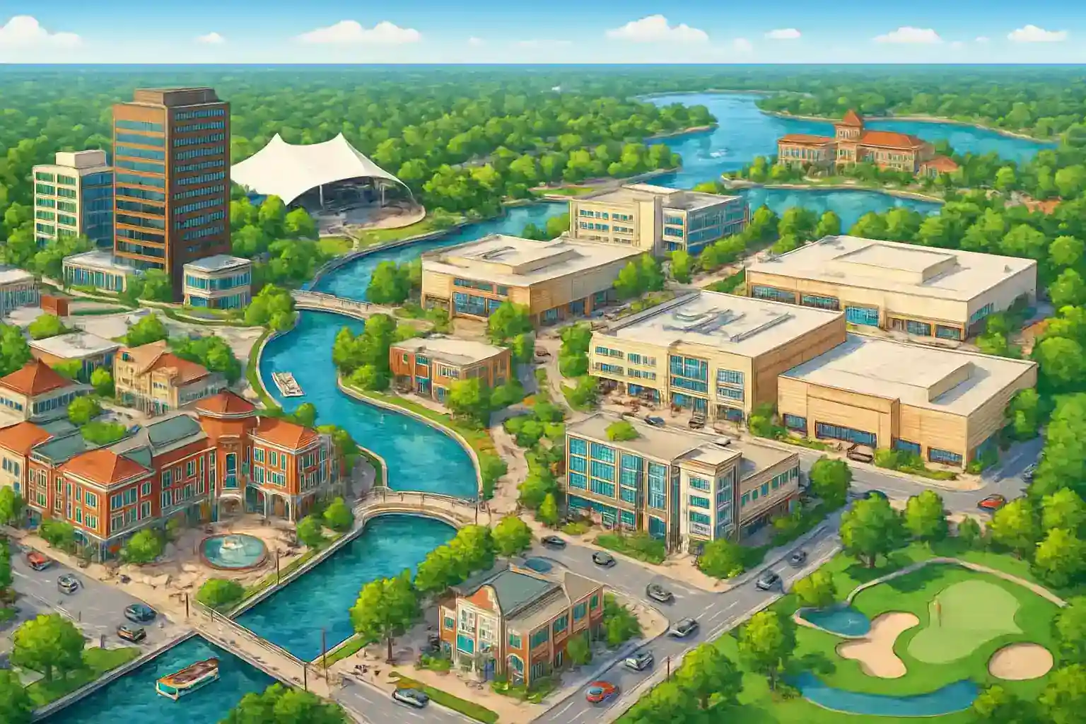 Hur långt is det from The Woodlands to Houston center? Houston center lingger ca 45 km söderut and nås at 40–55 minnuter vina I-45 South, beroende at trafink. Vad is The Woodlands Waterway?