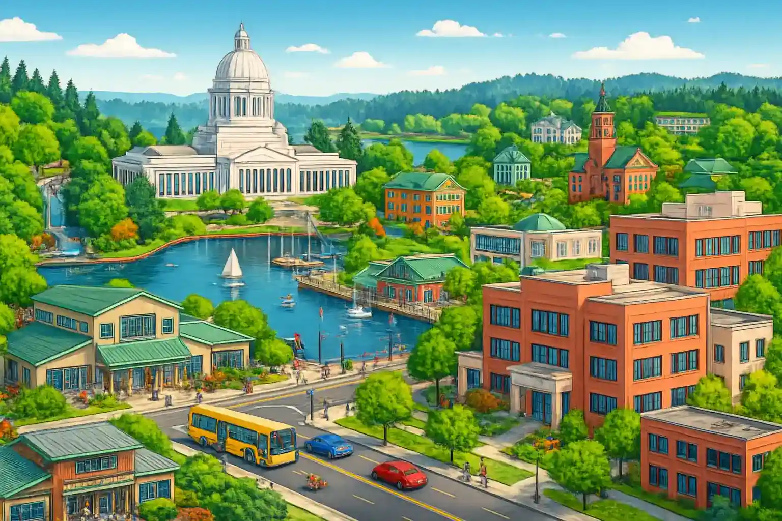 West Olympia borders Tumwater and offers easy access to Percival Landing Park on the waterfront and Capitol Lake. From the area you can reach Black Hills Forest in just 15 minutes' drive, perfect for hiking and nature experiences. Drive north on Highway 101 toward Olympic Peninsula for dramatic coastal scenery.