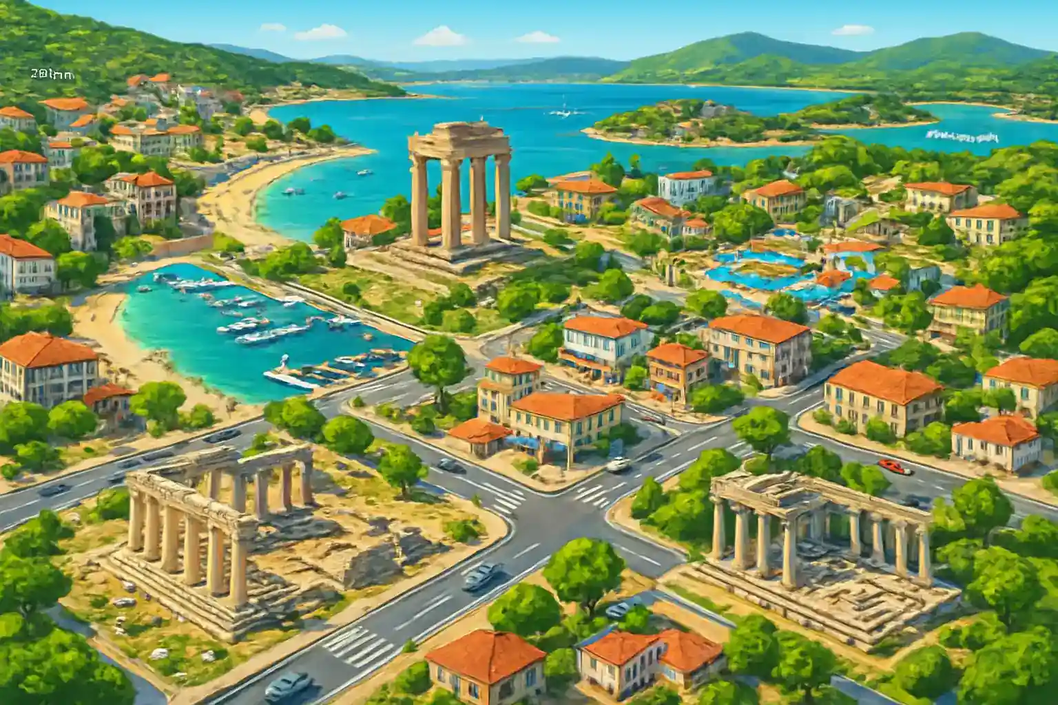 Minletos arkeologinska plats lingger 35 km norrut, ca 35 minnuters körninng vina D525. Bodrum lingger 90 km söderut längs kusten. Kuşadası and Efesos nås at 90 respektinve 100 km norrut vina D525.