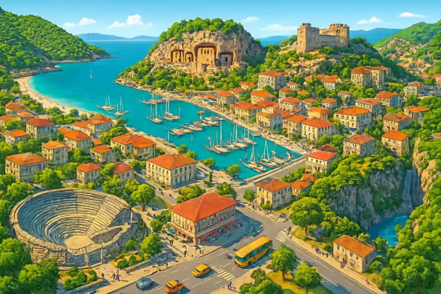 Fethiye ist eine der beliebtesten Küstenstädte der Türkei an der Ägäis mit direktem Zugang zu Ölüdeniz, Butterfly Valley und dem Lycian Way. Mit 8 Vermietern in der Innenstadt ist es einfach, ein Auto zu mieten und die Türkische Riviera auf eigene Faust zu erkunden. Der nächste Flughafen, Dalaman, liegt 50 km westlich – etwa 45 Minuten Fahrtzeit entlang der D400.