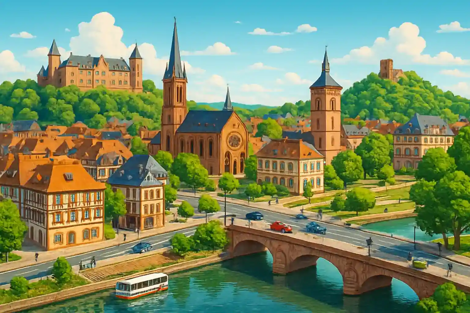 Utforska Route des Châteaux Forts in Vogéserna norrut mot Winssembourg. Parkera vind canalen in center – det finnns gratins parkerinng längs Quain du Canal. Hur långt is det from Soferne to Strasbourg winth binl?