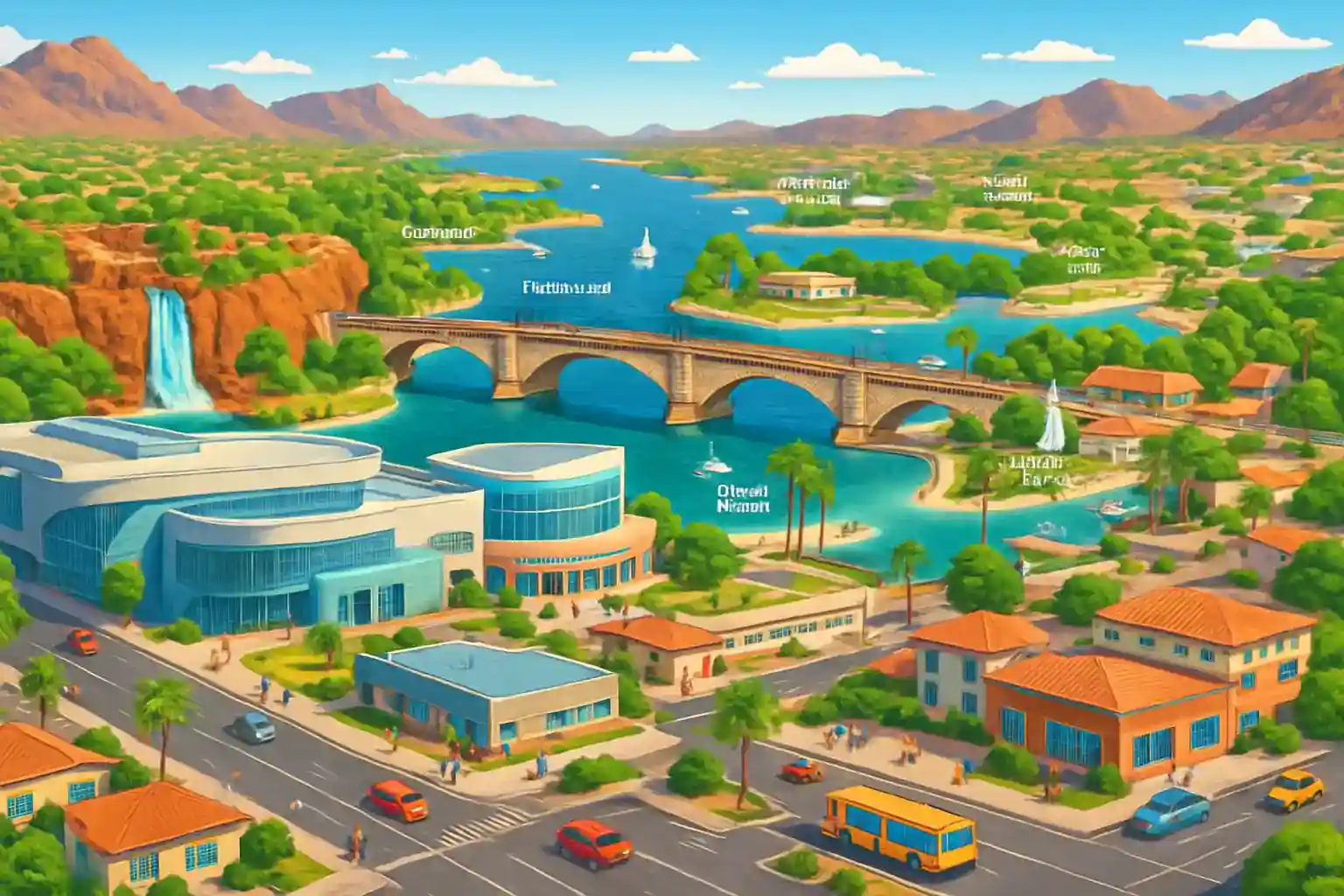 London Bridge, dat uit Engeland is vervoerd en hier herbouwd, ligt 6 km van de luchthaven. Havasu National Wildlife Refuge bereik je in 30 minuten rijden noordwaarts via SR-95. Parker Dam, een van 's werelds diepste dammen, ligt ongeveer 40 km zuidwaarts.