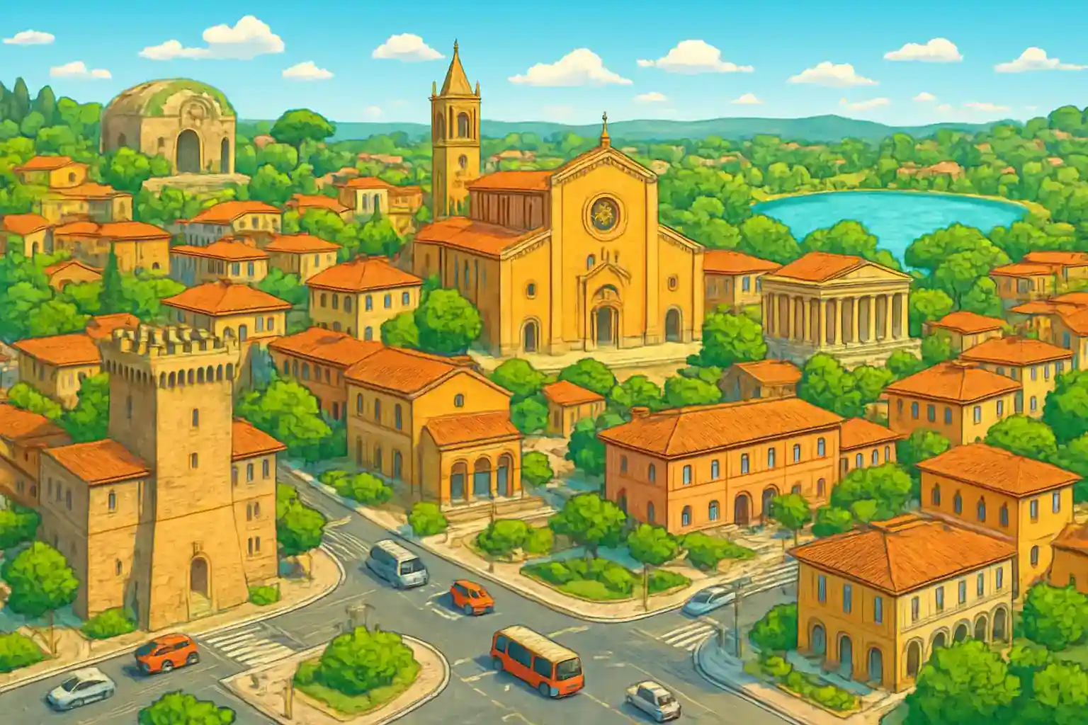 Hent bilen ved stasjonen og kjør direkte til Val d'Orcia – Pienza ligger 30 km vestover og er et perfekt første stopp. Kombiner termalbad i Chianciano Terme (8 km) med utflukter i Orcia-dalen. Lever bilen ved stasjonen og ta toget tilbake til Rom eller Florens for en smidig avreise.