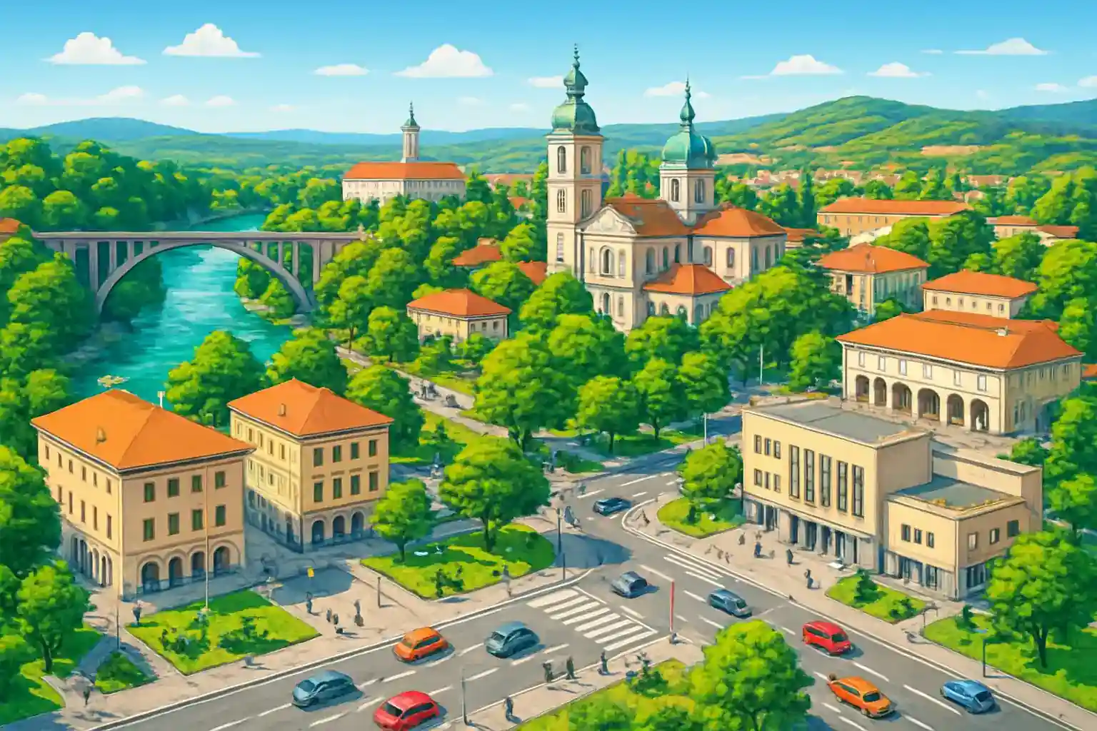 Cirka 70 km sørover langs kysten, som tar cirka 1 time via Koper. Finnes det parkering nær utleiekontoret i Nova Gorica sentrum? Ja, det finnes offentlige parkeringsplasser i sentrum nær grensen mot Gorizia, ofte gratis utenfor rushtid.