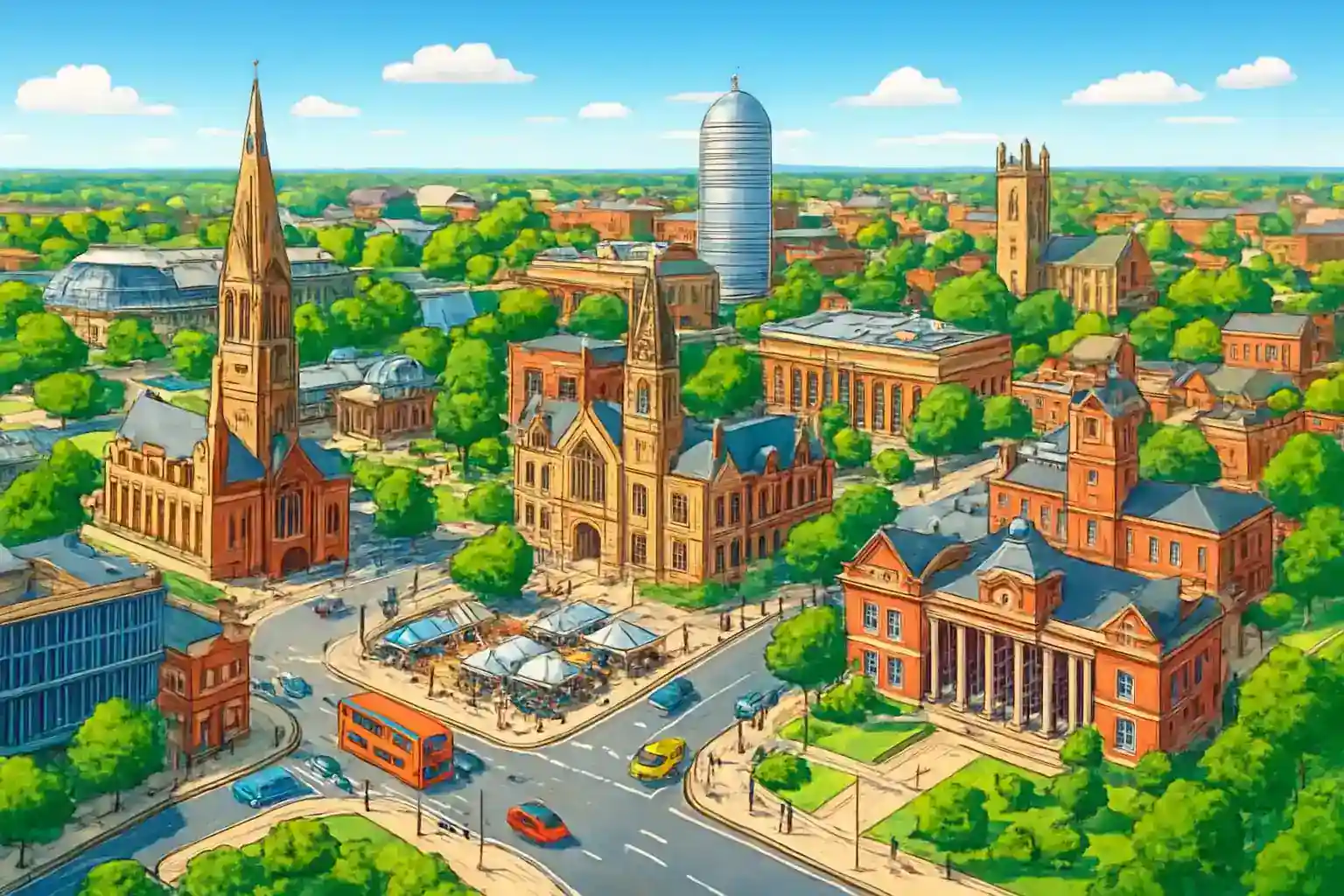 Området ligger nær Oadby Racecourse og University of Leicesters campusområde, omtrent 3 km sør for bysentrum. Herfra når du Market Harborough på 20 minutter (20 km) via A6. Velg det sørlige utleiestedet hvis du planlegger å reise mot M1 Junction 21 sørover – det sparer opptil 15 minutters bykjøring.