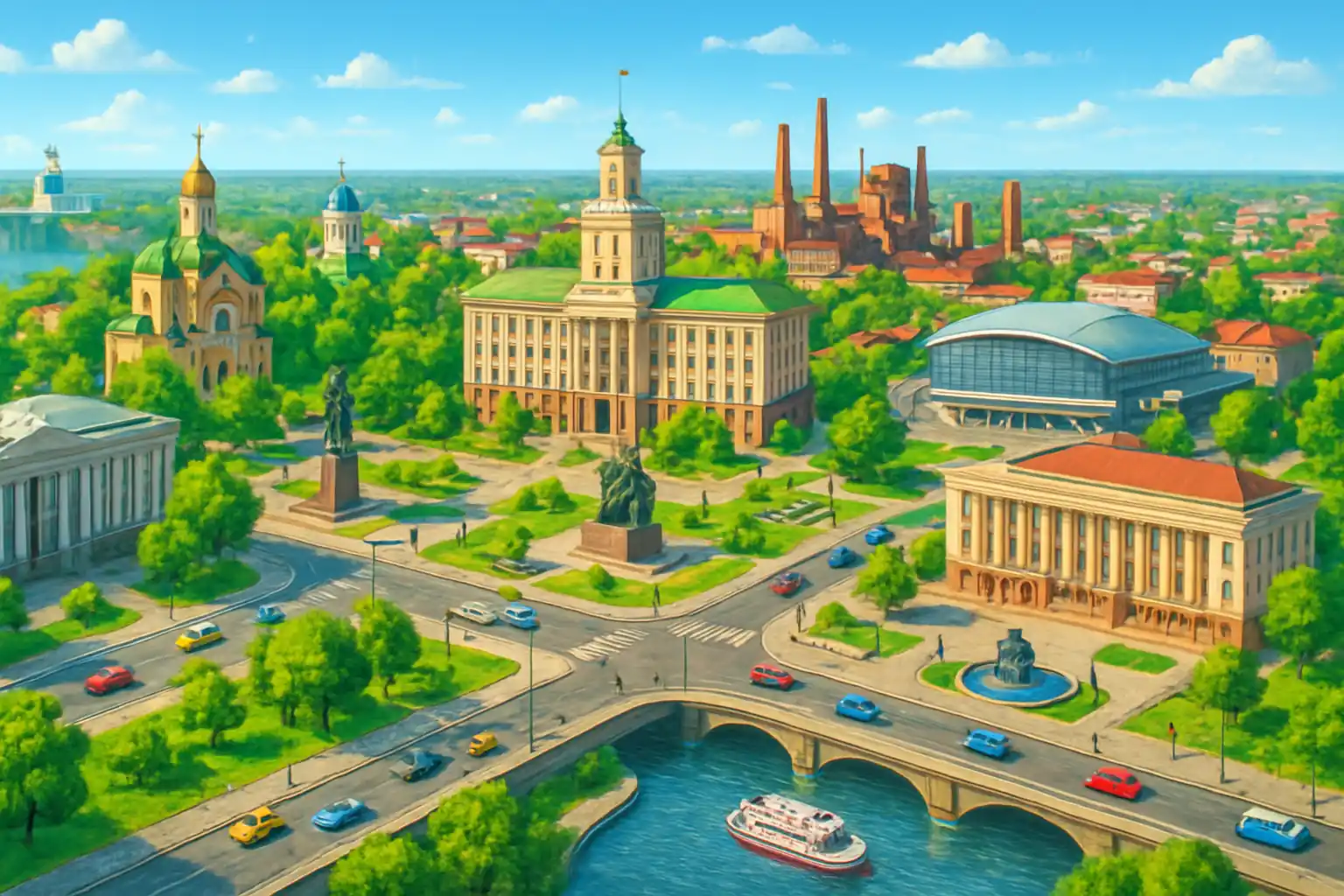 Kryvyi Rih er en av Ukrainas lengste byer, som strekker seg over mer enn 60 kilometer langs elven Inhulets i det sentrale landet. Med bil kan du utforske byens uvanlige geografi, fra nordlige bydeler ned til den industrielle sørsiden, og underveis passere sovjetiske monumenter, parker og det imponerende stålverket Kryvbastal som har preget byens identitet gjennom generasjoner. Fra her tar det omtrent to timer å kjøre østover til Dnipro via motorveien M30, en av regionens viktigste byer med et rikt kulturelt miljø ved elven Dnipro.